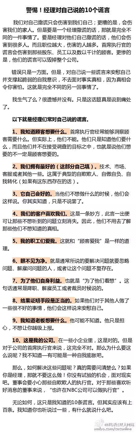 1、我知道顾客想要什么;2、我们拥有最好的(这部分自己填);3、它自己会好的;4、我们的客户喜欢我们;5、我的职工们爱我;6、眼不见为净;7、为了他们自身利益;8、结果证明手段是正当的;9、我知道老板想要什么;10、这是我的公司。
