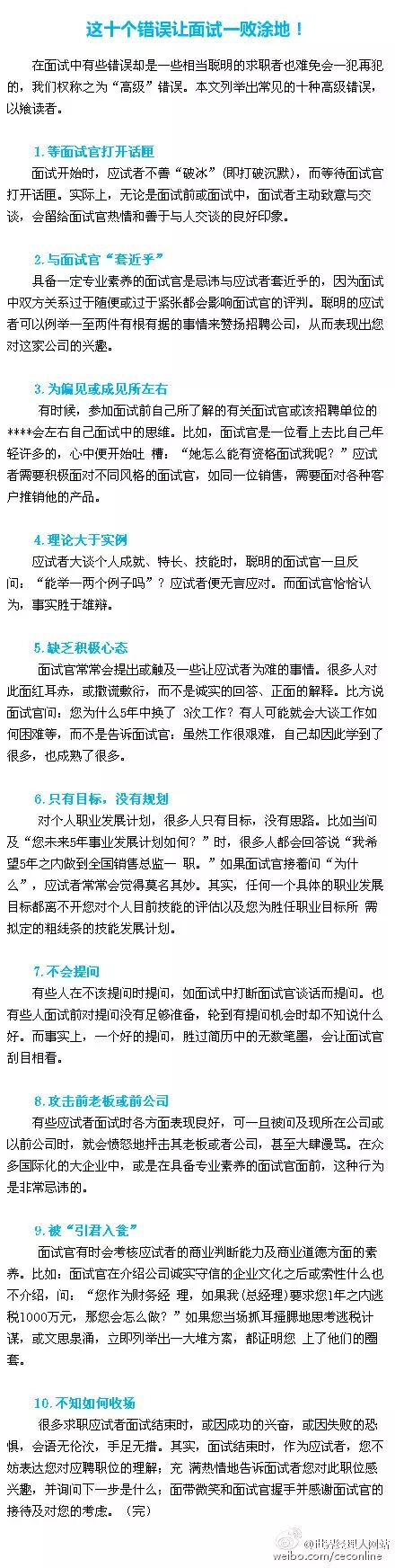 1.等面试官打开话匣。2.与面试官“套近乎”。3.为偏见或成见所左右。4.理论大于实例。5.缺乏积极心态。6.只有目标,没有规划。7.不会提问。8.攻击前老板或前公司。9.被“引君入瓮”。10.不知如何收场 。